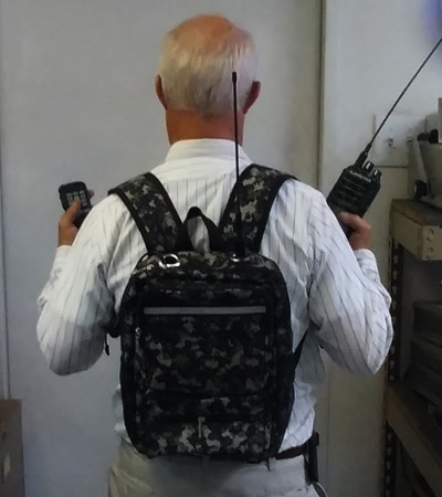 Manpack Camo is VHF/ UHF 25 watts with built-in LiON 12 amp hour battery pack, charger, mike, antenna and room for more gear in the pack.
